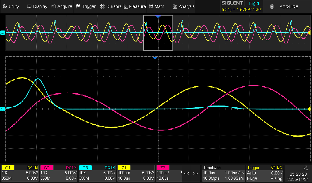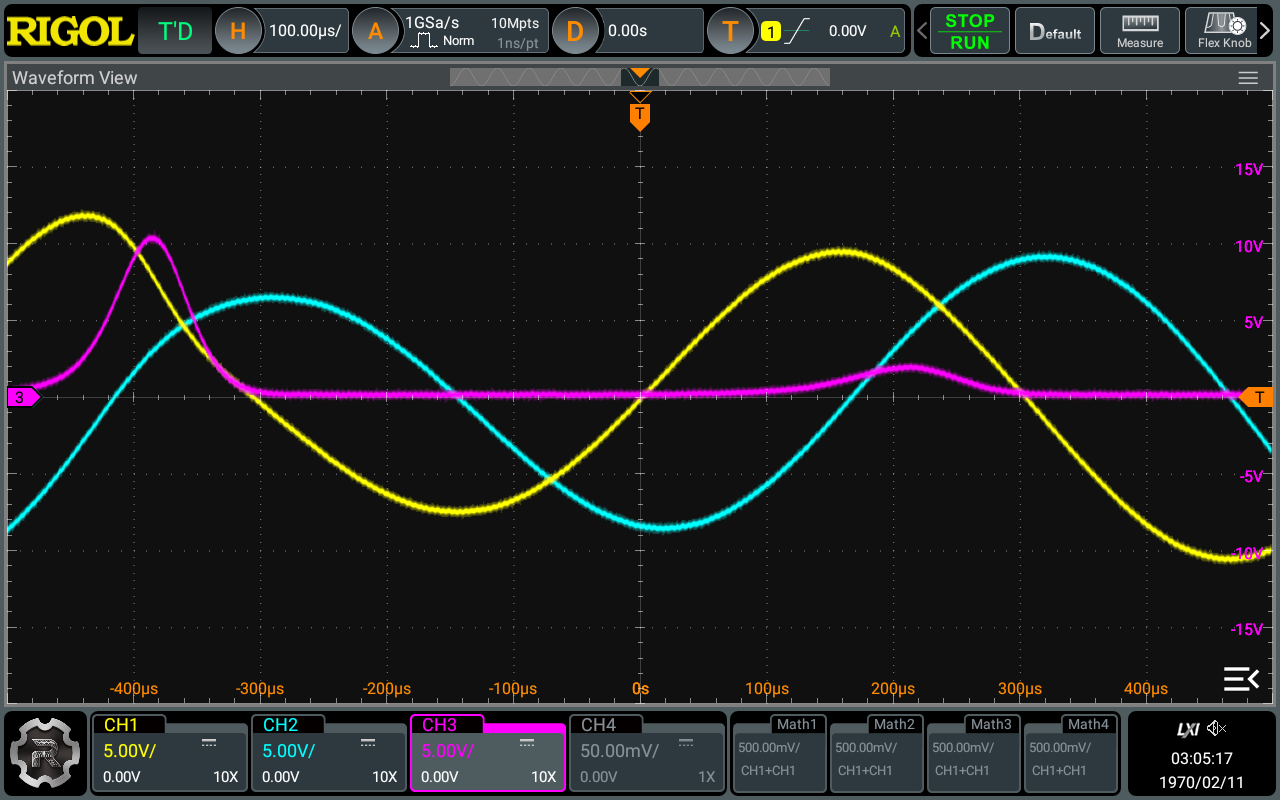 Here we sequence the thrid channel to come on 90ms after the first two.